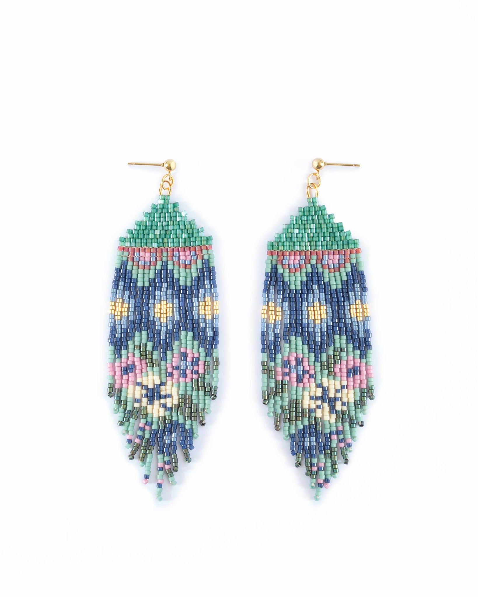 Inspired by the intricate woven Huipil textiles of Guatemala, these statement fringe earrings combine a monotone top woven portion made from high light reflecting beads and a beautiful cascade of colourful fringe. The fringe incorporates geometric and floral patterns which are a nod to the symbolic motifs found in Huipiles. The beaded portion is hung from a stainless steel ball post. These earrings are handwoven by women artisans from vulnerable communities in Medellin, Colombia who receive fair working conditions and compensation for their skills. Materials Miyuki Glass Beads Stainless Steel Post Size: Length 3.75 Inches Width 1.25 Inches