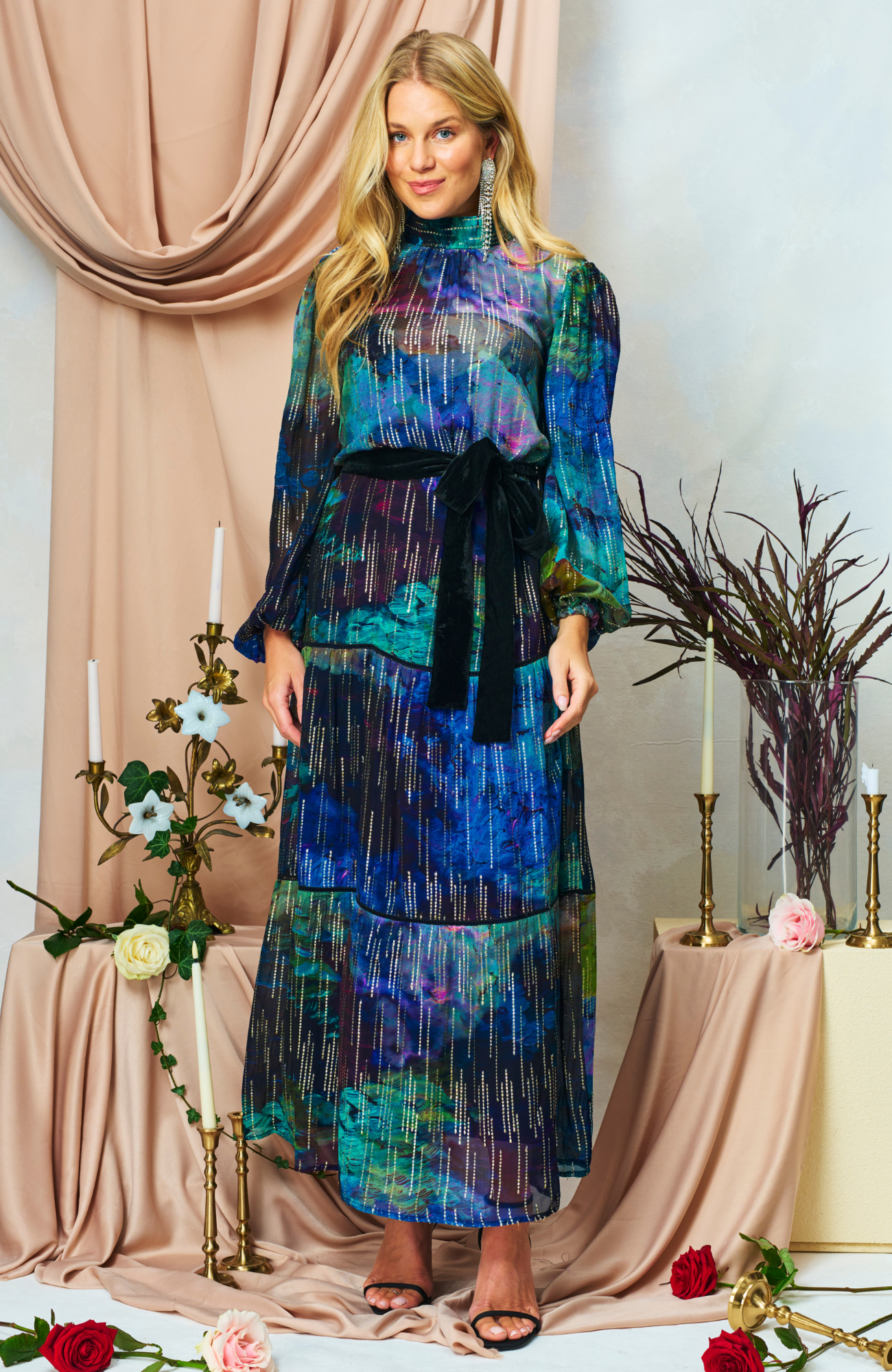 The Jadene High Neck Blouson Sleeve Midi Dress with Velvet Belt