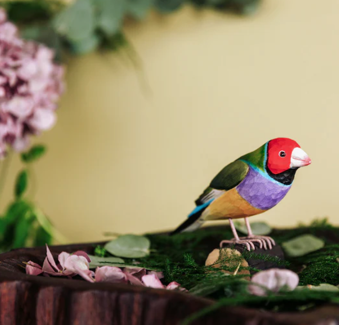 DecoBird GOULDIAN FINCH is a life-like wooden bird that is carved and painted by hand.