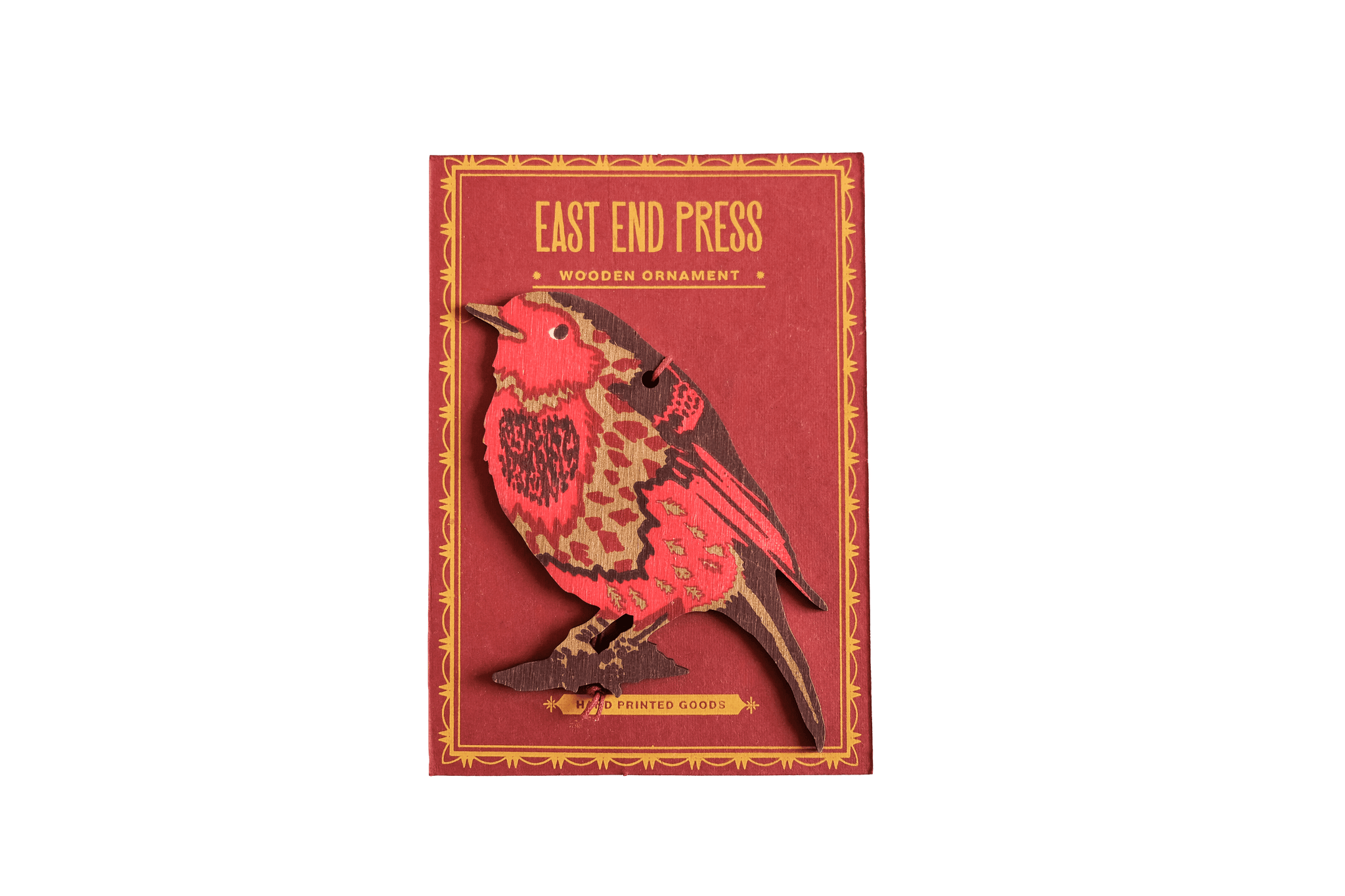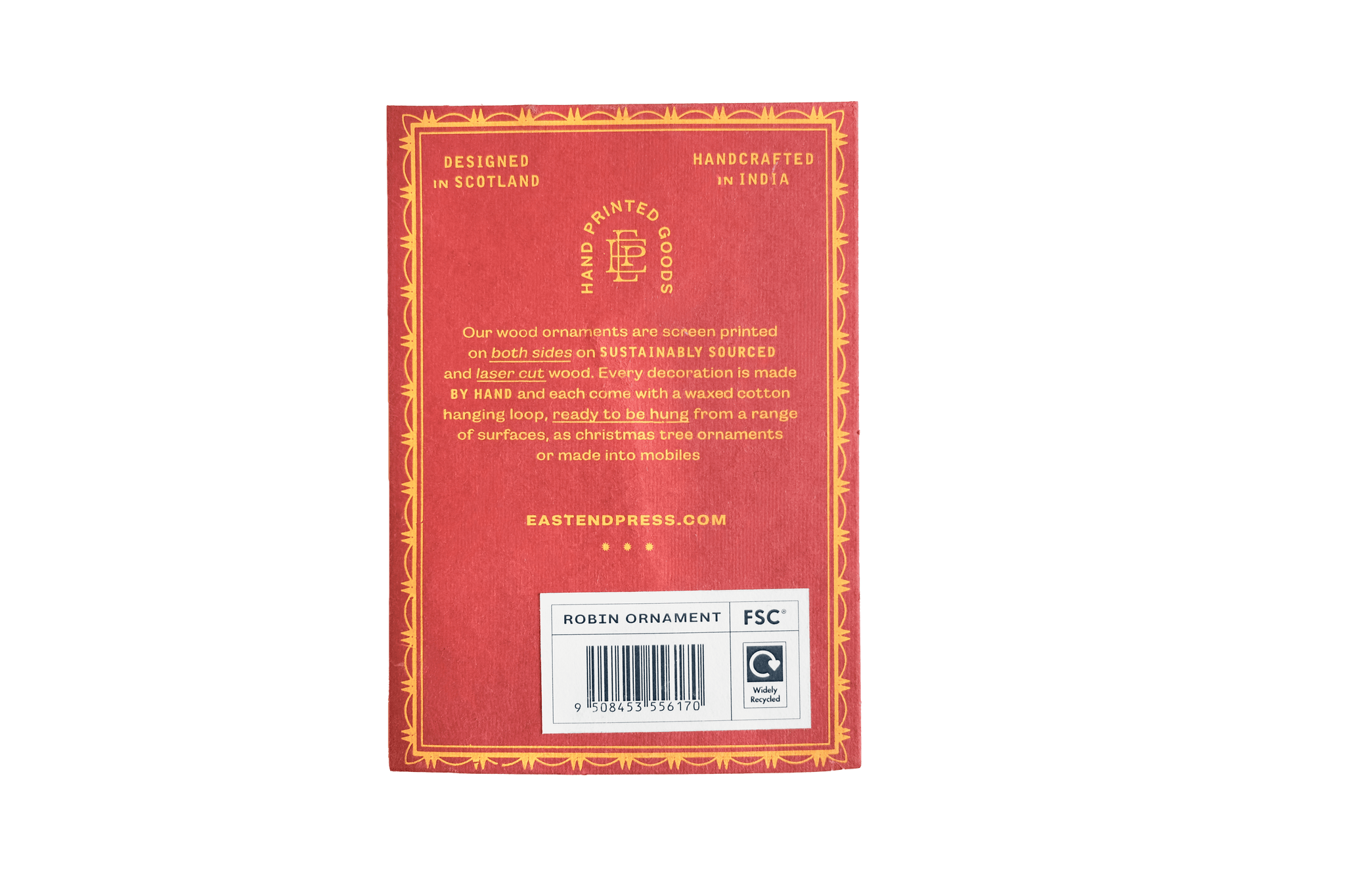 Hand-screen printed onto high quality plywood, this delightful decoration features a beautifully detailed robin design. Minimum order: 6 - Screen printed decorative ornament - Screen printed by hand on both sides by talented artisans in Jaipur - Sustainably made from FSC certified plywood
