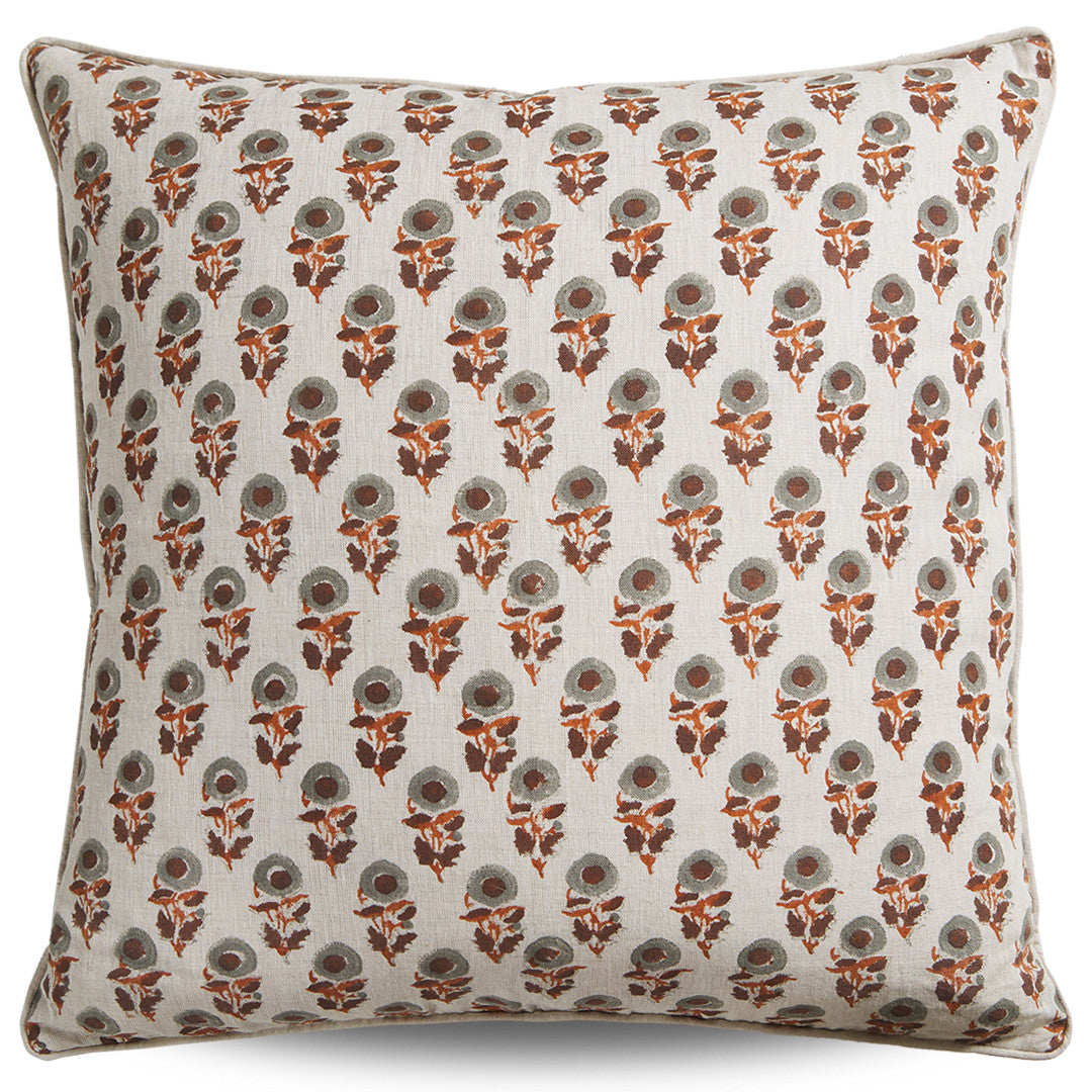 The Tarlow Hatfield Cushion Cover boasts an intricate, repeated floral design in rust, chestnut brown and grey tones, with a matching stencil design on the reverse and piping edge.