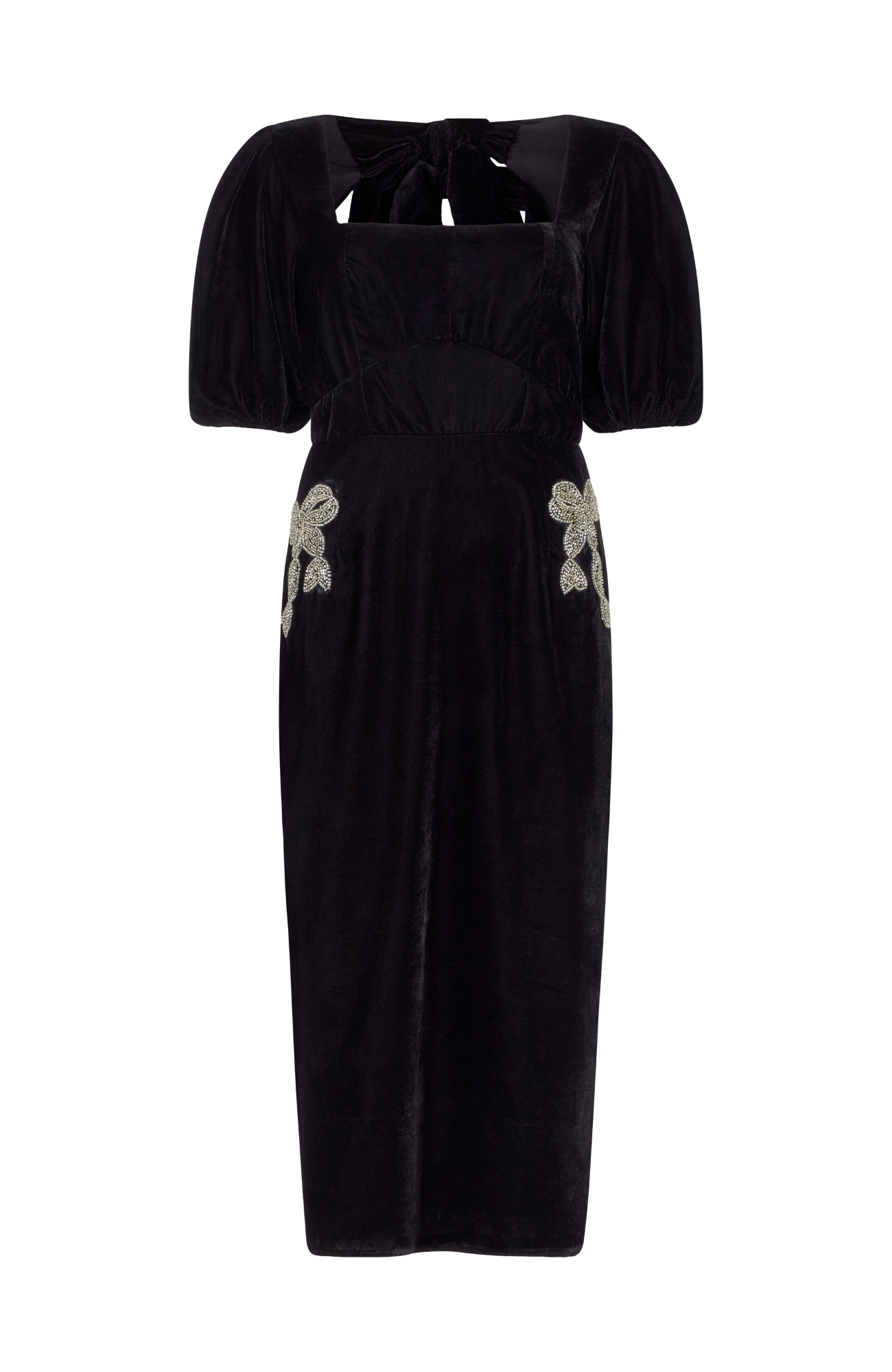 The Alba Puff Sleeve Midi Dress With Embellished Bow Details