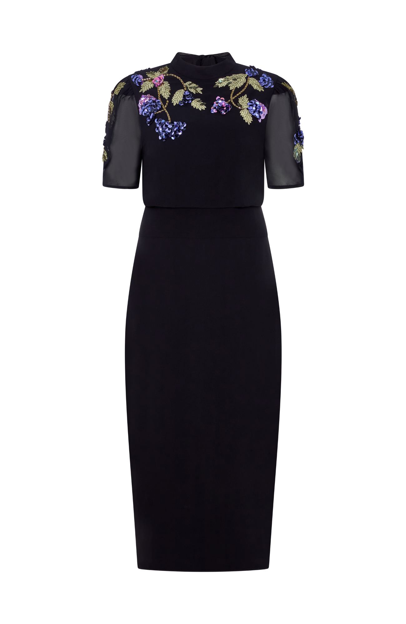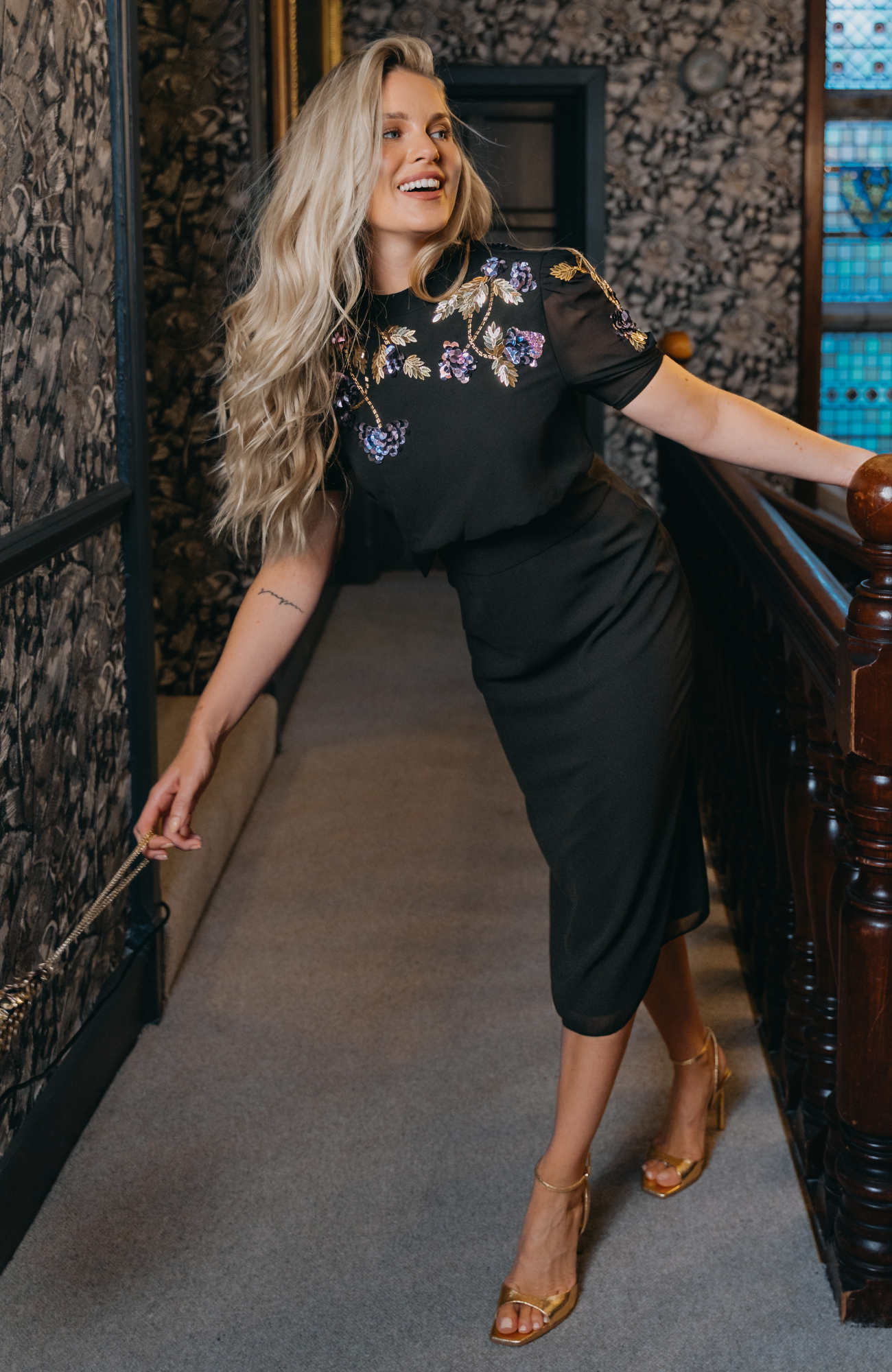 This timeless black Hope & Ivy midi dress is a must-have for your wardrobe. The Juno is ornately embellished with gold and purple sequins for a 3D effect, while the back bow details creates a feminine finish. The round neckline and pencil skirt create a stunning silhouette, sure to become an instant classic.