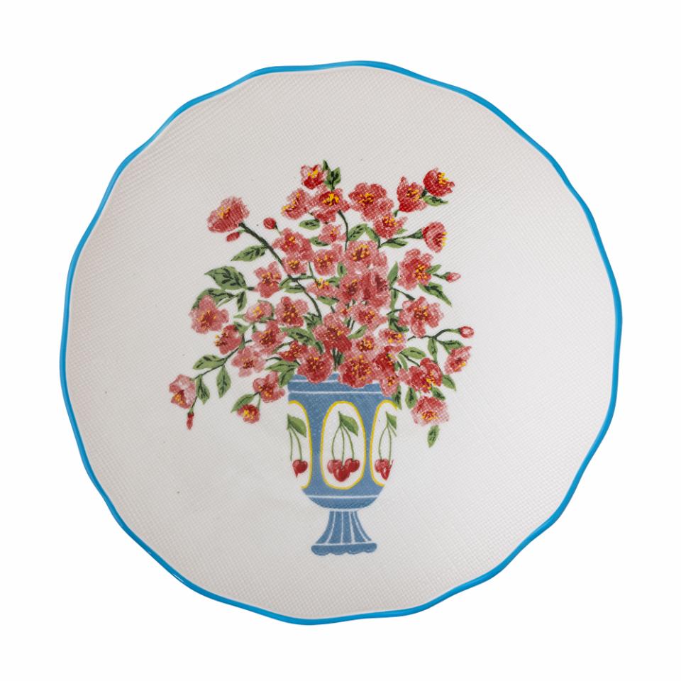 The Dorothy Bowl by Bloomingvilleis a beautiful stoneware bowl decorated with a delicate embossed floral motif that resembles embroidery, in shades of red, green, and blue. The bowl features a ribbed blue rim, adding a refined touch. Perfect for serving salads or pasta dishes.
