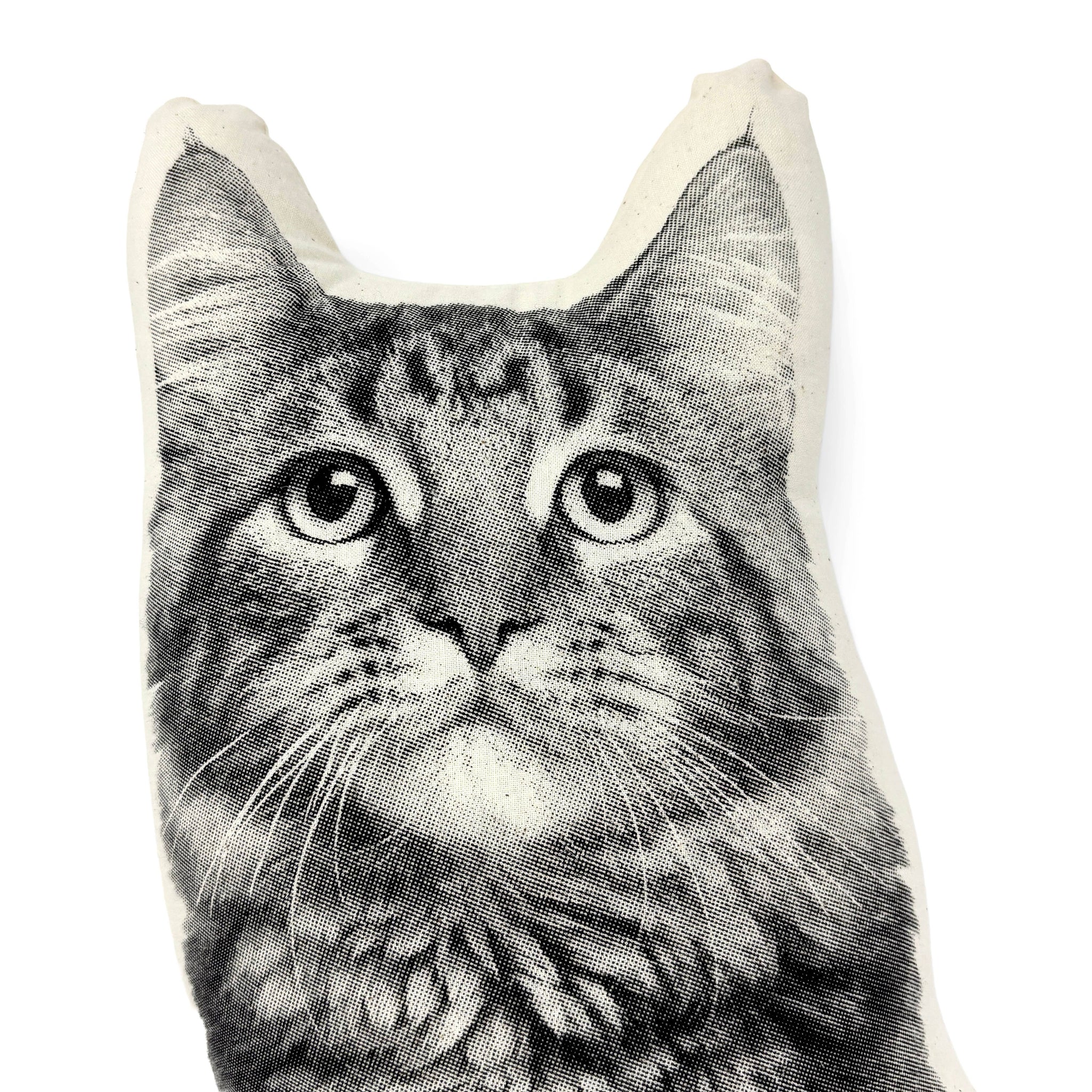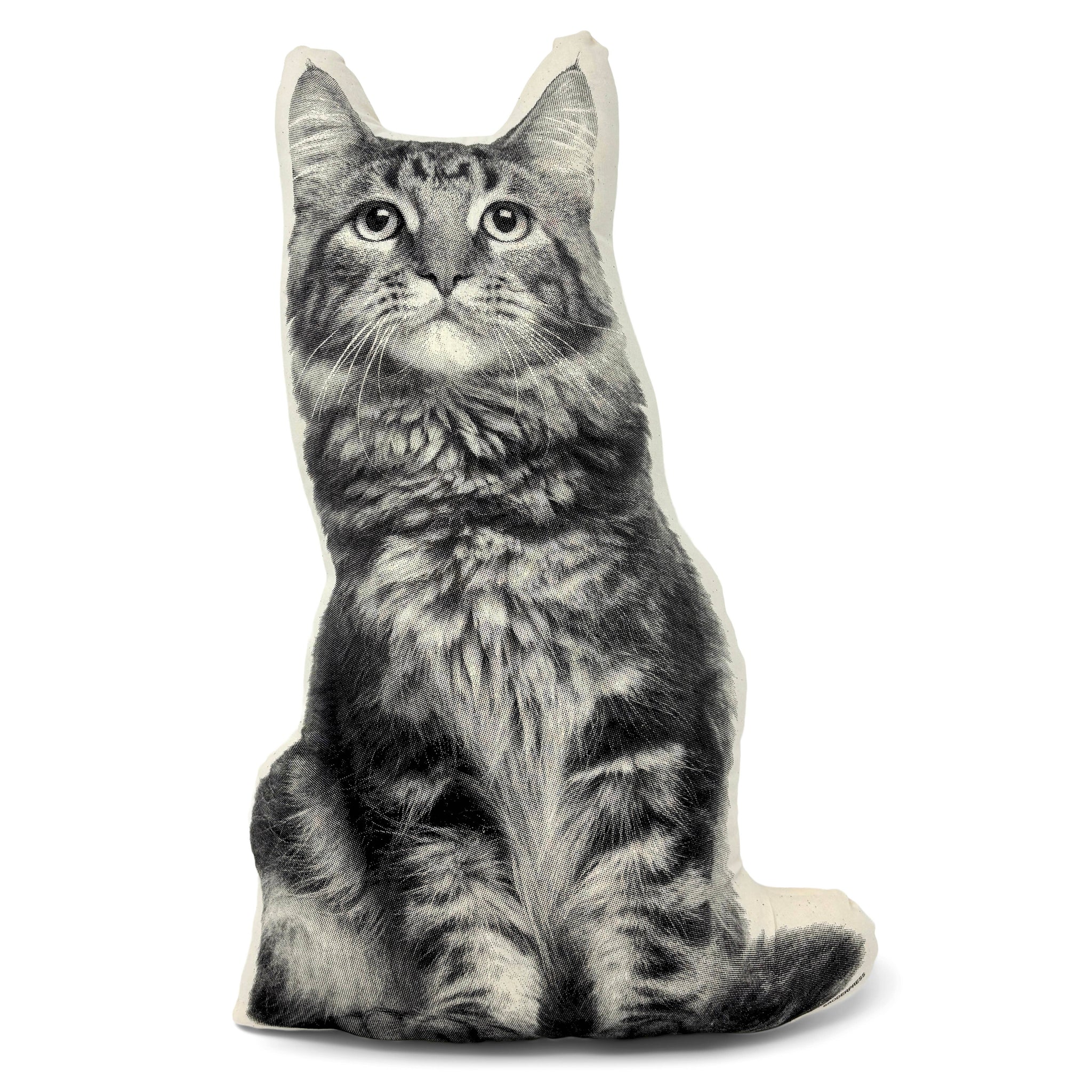 Hand Silkscreened, Contour Shaped Maine Coon Cat Pillow Pillow measures: 11"x17" Printed on one side, hand stitched seam Care instructions: Spot clean only, not machine washable. Materials: All pillows have been silkscreened with non-toxic water based fabric paint. They are printed on muslin fabric and stuffed with 100% polyfil.