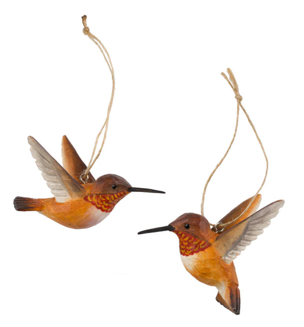 RUFOUS Hummingbird is a pair of life-like wooden birds that are carved and painted by hand.