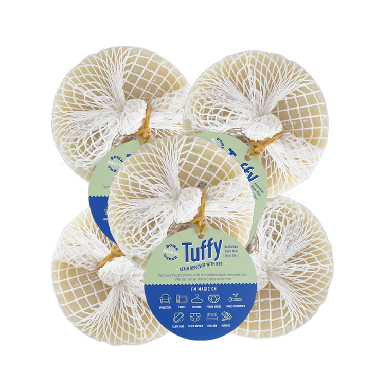 Looking for TUFF, well you’ve found it! Our handmade Tuffy soap is the magic all-rounder when it comes to removing tough stains. Packed full of Australian Bush Mint Essential Oil and covered with a net to enhance friction for greater stain removal. Use as a stain remover or pre-treater for machine or hand washing.