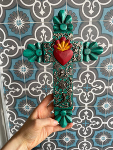 WOODEN CROSS W/HEART & MILAGROS - GREEN OR PINK