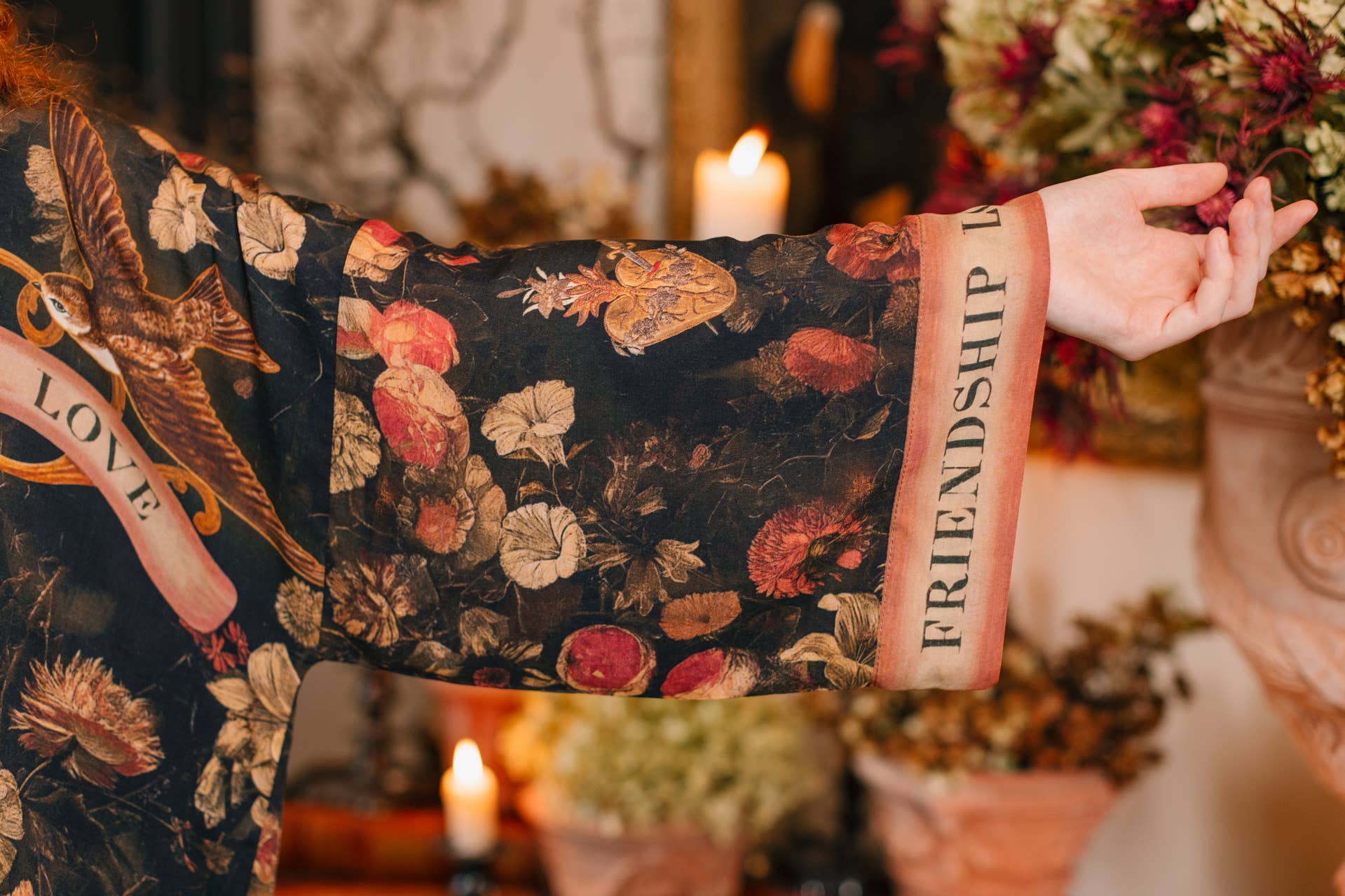 Introducing Heart of Gold — our beautiful & dramatic new collection that celebrates the bonds in our lives that endure. Designed using an intricate collage of antique artwork, it features hand-painted swallows from an 1865 scrapbook, floral wreaths done in the 1600s, and a sacred heart from Notre Dame in France, which was embroidered with gilded thread and completed in 1872. The two swallows with wings outstretched carry a ribbon between them as a reminder that even across distances, those we love will always be a part of us. The vintage banner proudly displays the motto “friendship, love, and truth” -- a declaration of what truly matters. 100% viscose (derived from plant fibres such as wood and bamboo). Machine wash gentle or handwash and hang to dry.