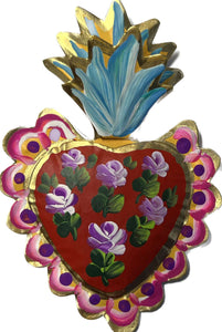 TIN WALL HANGING HAND PAINTED HEART WITH PURPLE ROSES