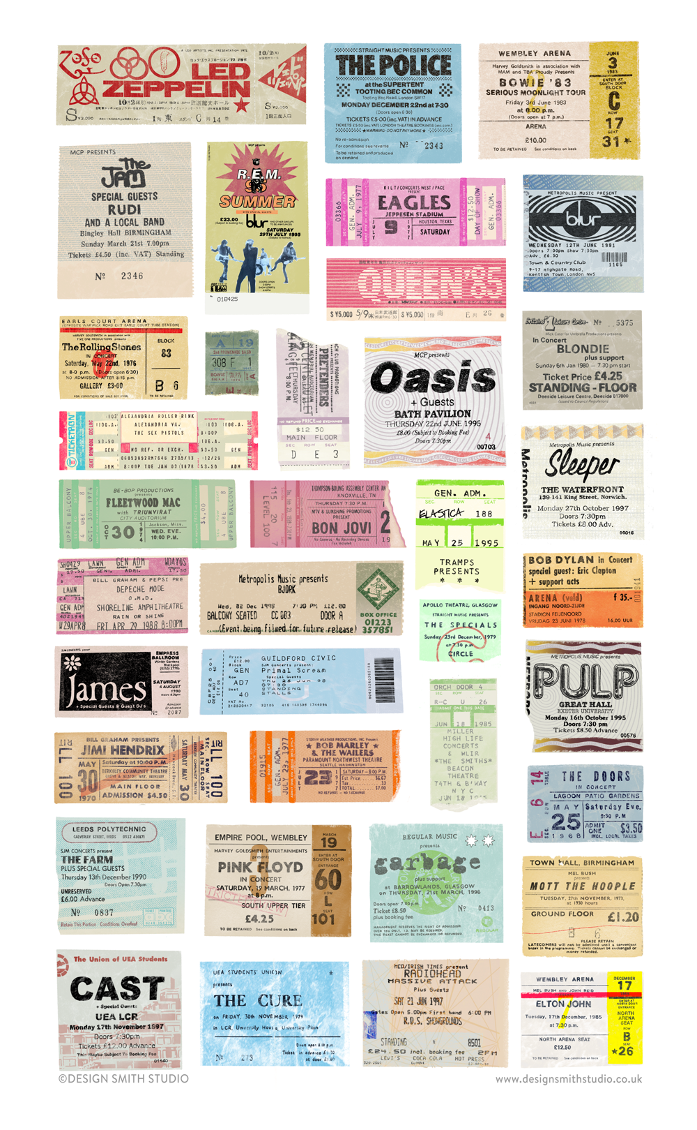 A tea towel featuring a collection of my original 70's, 80s and 90's gig ticket illustrations including artists such as Bowie, Oasis, The Rolling Stones, The Sex Pistols, Queen, REM, The Jam and many more.