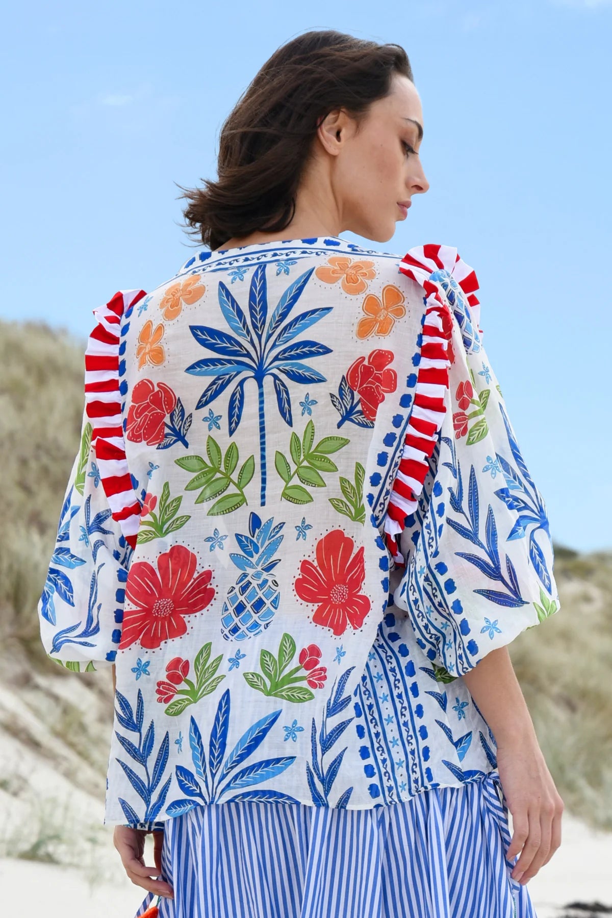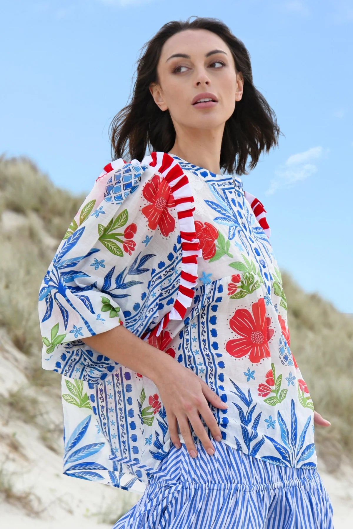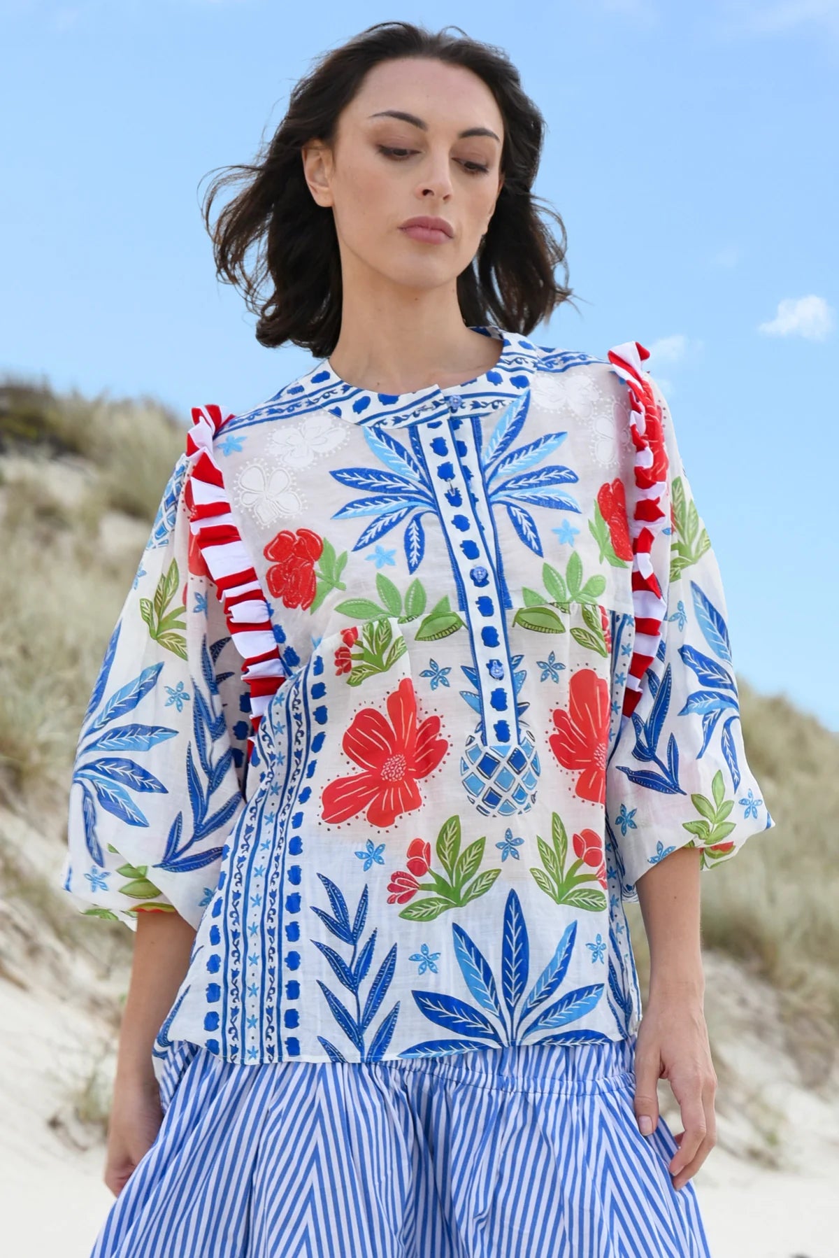 Bold floral embroidery takes centre stage on the 'Modern Edge' blouse, a piece that blends artistry with contemporary design. Crafted in the vivid 'Pineapple Punch' ramie, it’s finished with a partial button-through front and contrast striped ruffle trims that add modern definition. Elasticated cuffs complete the silhouette with ease, making this blouse a striking statement with a touch of play.