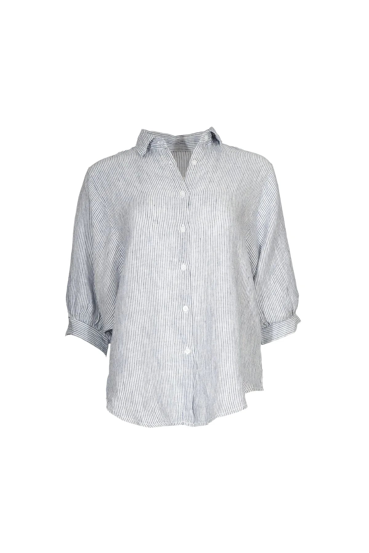 The Sienna shirt features a button-down front, gently structured collar, and 3/4-length sleeves with turned cuffs, while the dropped shoulders and curved hem add casual charm. Made from breathable, yarn-dyed 100% linen with fine stripes, the fabric softens beautifully over time, making this timeless piece perfect for layering or wearing on its own with understated elegance.