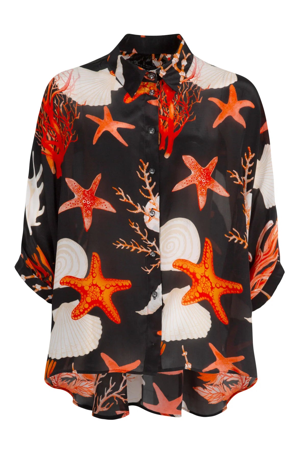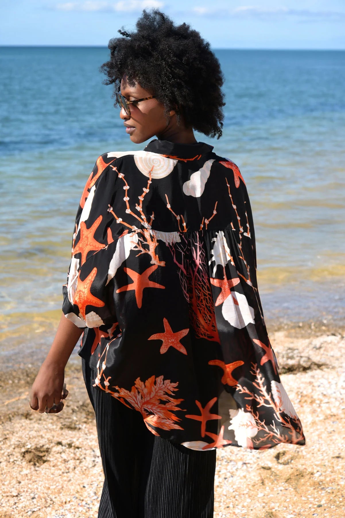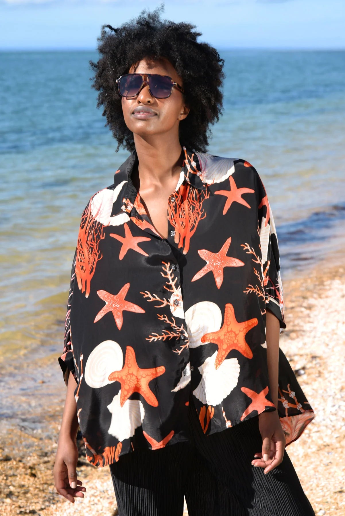 With endless styling opportunities the ‘Behind Her Back’ shirt is a summertime must have. Showcasing a bold seascape design through its ‘Break the Shell’ viscose satin, this blouse sports a generous fit with seamless, batwing styled sleeves that fall to a fixed cuff. Full of movement and colour this shirt makes a statement on its own, or pair this open over your favourite separates as a light-coverage layer.