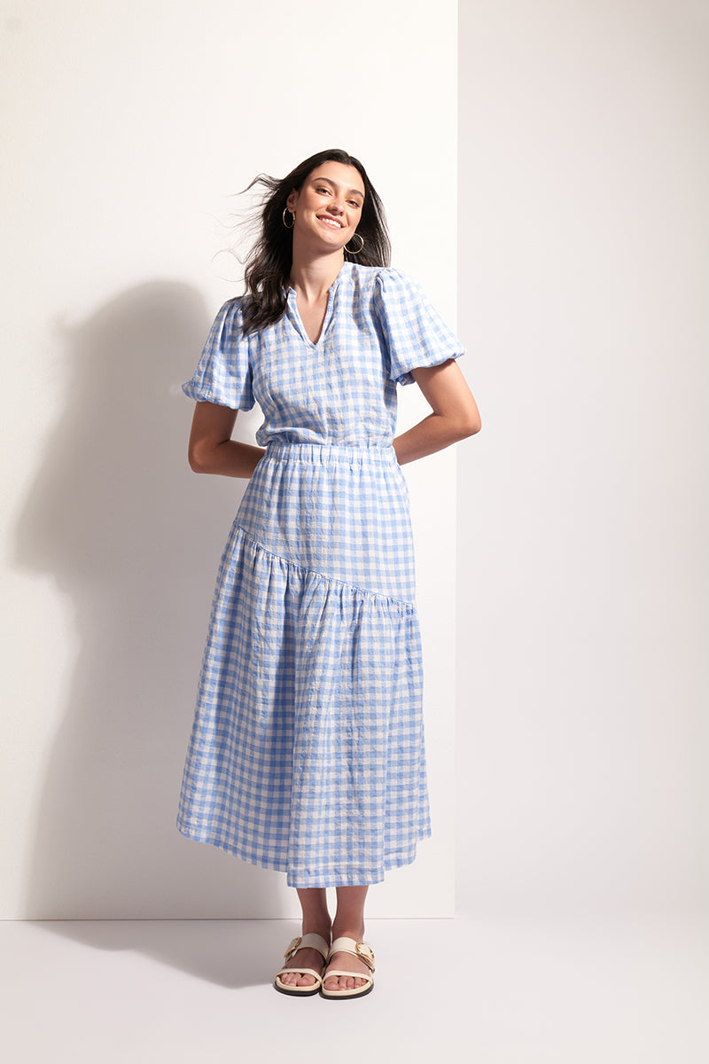 Summery sleeveless top with a soft round neckline, featuring statement blue check print and a curly ribbon trim hem.