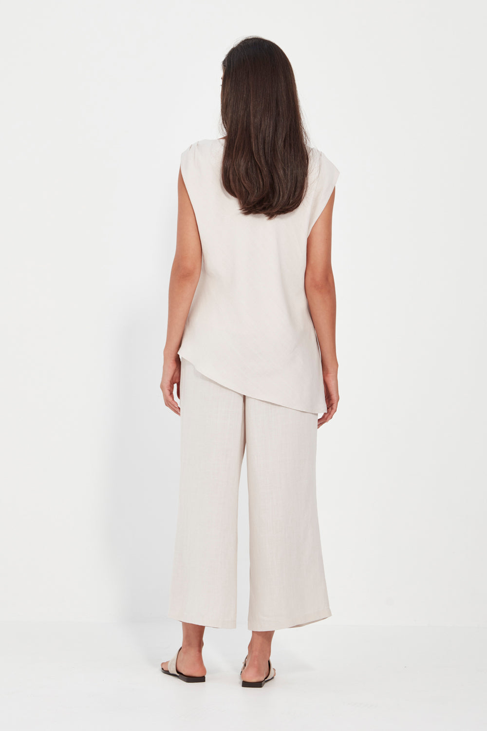 The Soho Top is crafted from a lightweight tencel-linen blend, offering a softly structured drape with a modern finish. Designed with a wide neckline and extended shoulder line for a flattering silhouette, it features gentle pleat detailing at the shoulder and an asymmetric hem that adds a contemporary edge. Skimming the body with ease, this top pairs perfectly with the coordinating Soho Pant for a polished, tonal look.