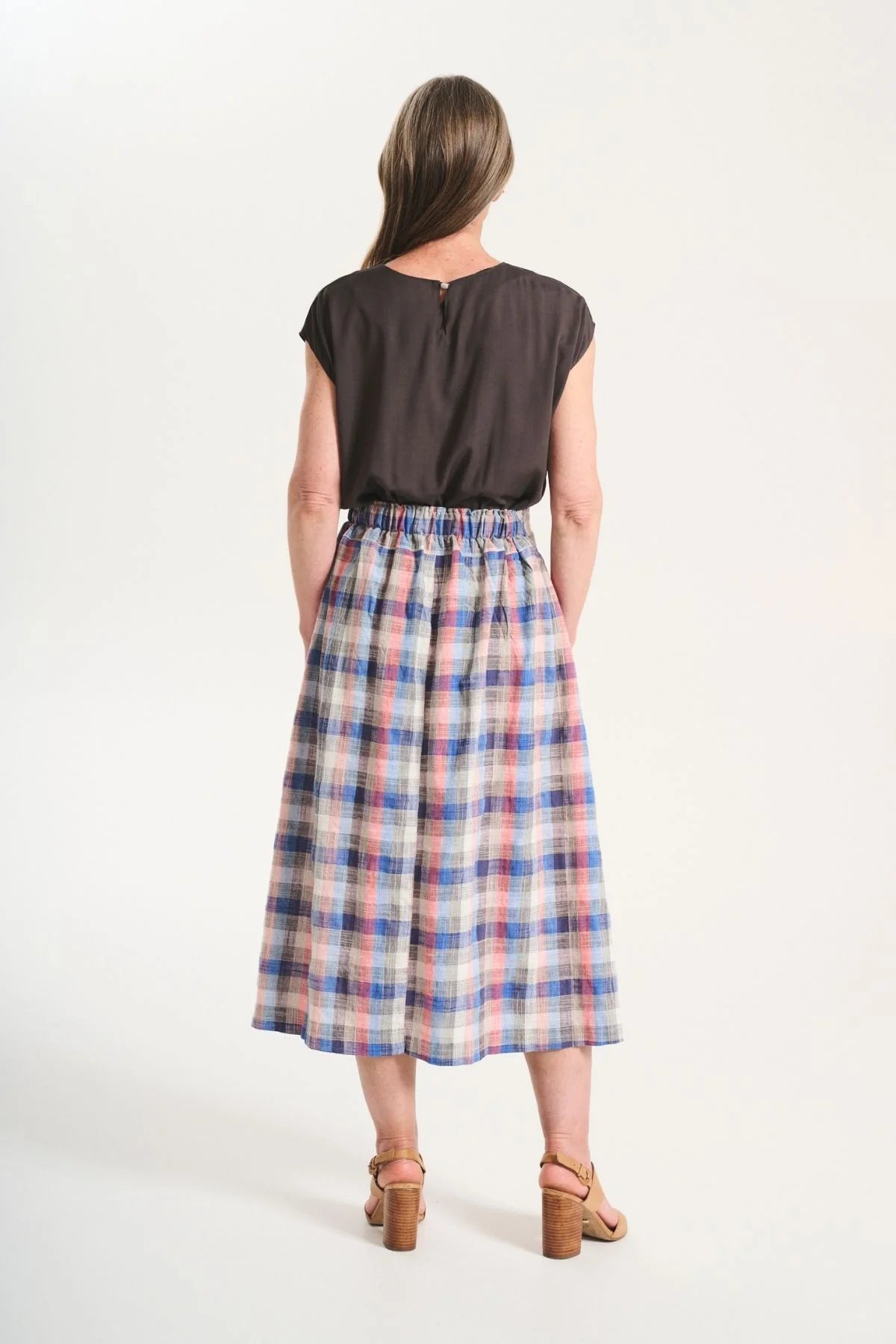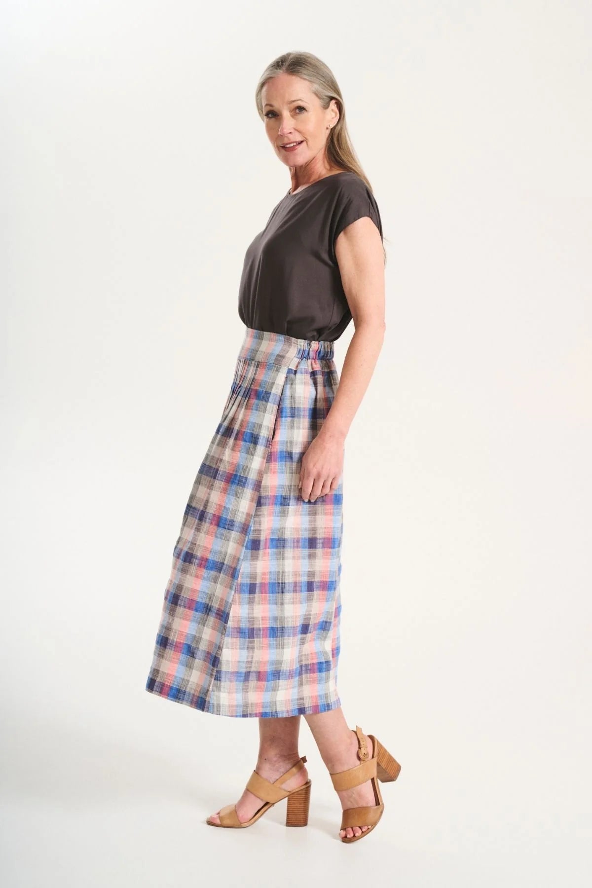 The Tangier Plaid Skirt combines timeless tailoring with a relaxed, modern ease. This pleated midi skirt features a gently structured silhouette with neat knife pleats falling from a wide, flat waistband, creating a flattering A-line shape that moves effortlessly while grazing mid-calf. Crafted from a lightweight yarn-dyed linen-cotton blend, it offers a softly washed hand-feel with subtle crispness.