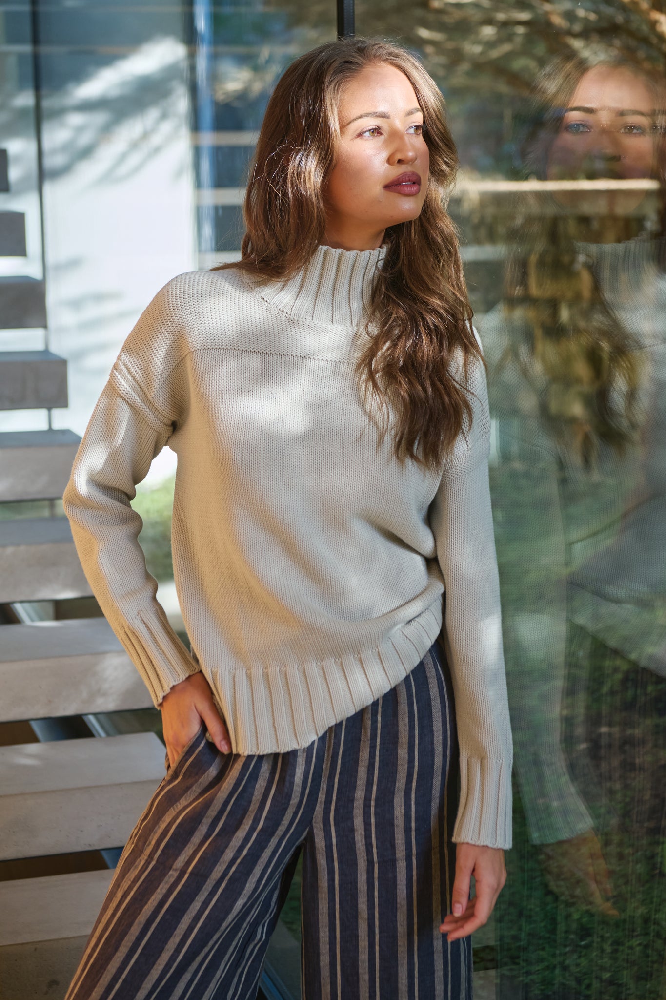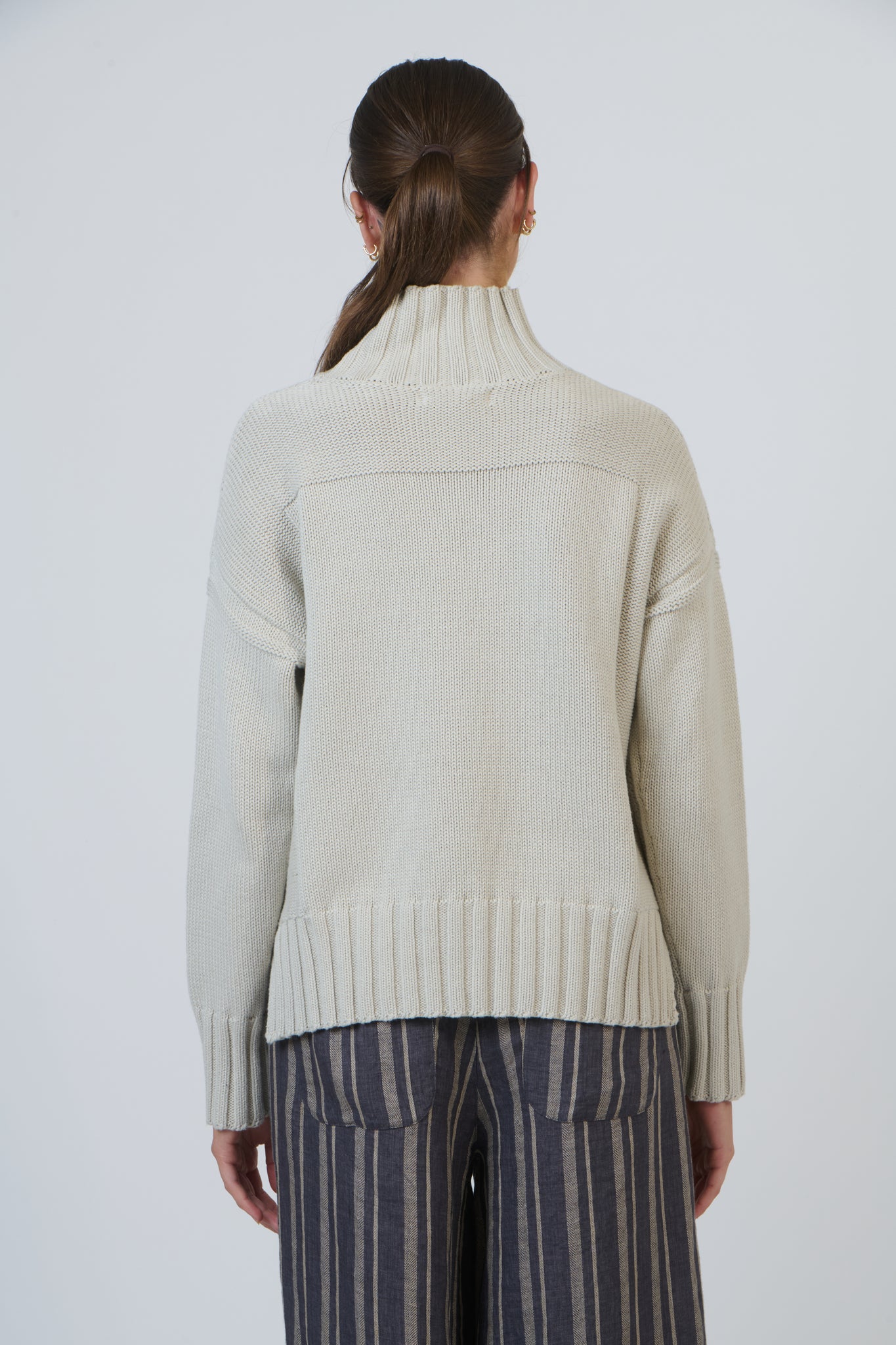This textured chunky knit and tall ribbed turtleneck make a subtle statement. A relaxed silhouette and drop shoulders keep it comfortable and