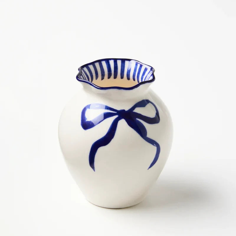 A sculptural vessel where form and function create perfect harmony. Hand-painted indigo ribbons loop with gentle asymmetry across this earthenware vase, created in our Sydney studio and brought to life by Vietnamese artisans. Perfect for a single stem on your bathroom shelf or bedside table an everyday object elevated through thoughtful design.