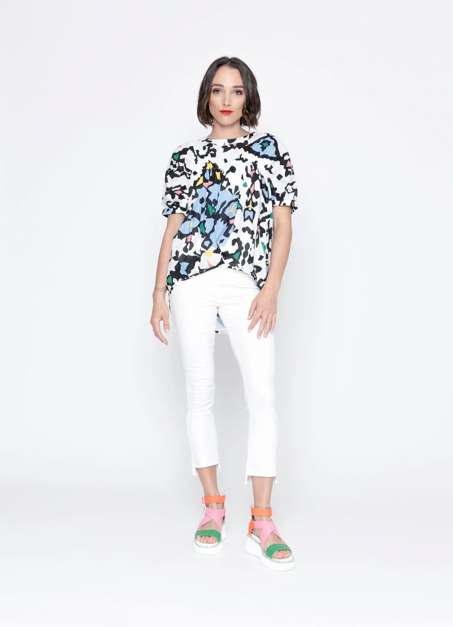 A statement top with personality! The Miles Top adds a fun, modern edge to your everyday look. The High/Low hem line sits perfectly, with elasticated sleeves and upper bust feature for a comfortable fit.