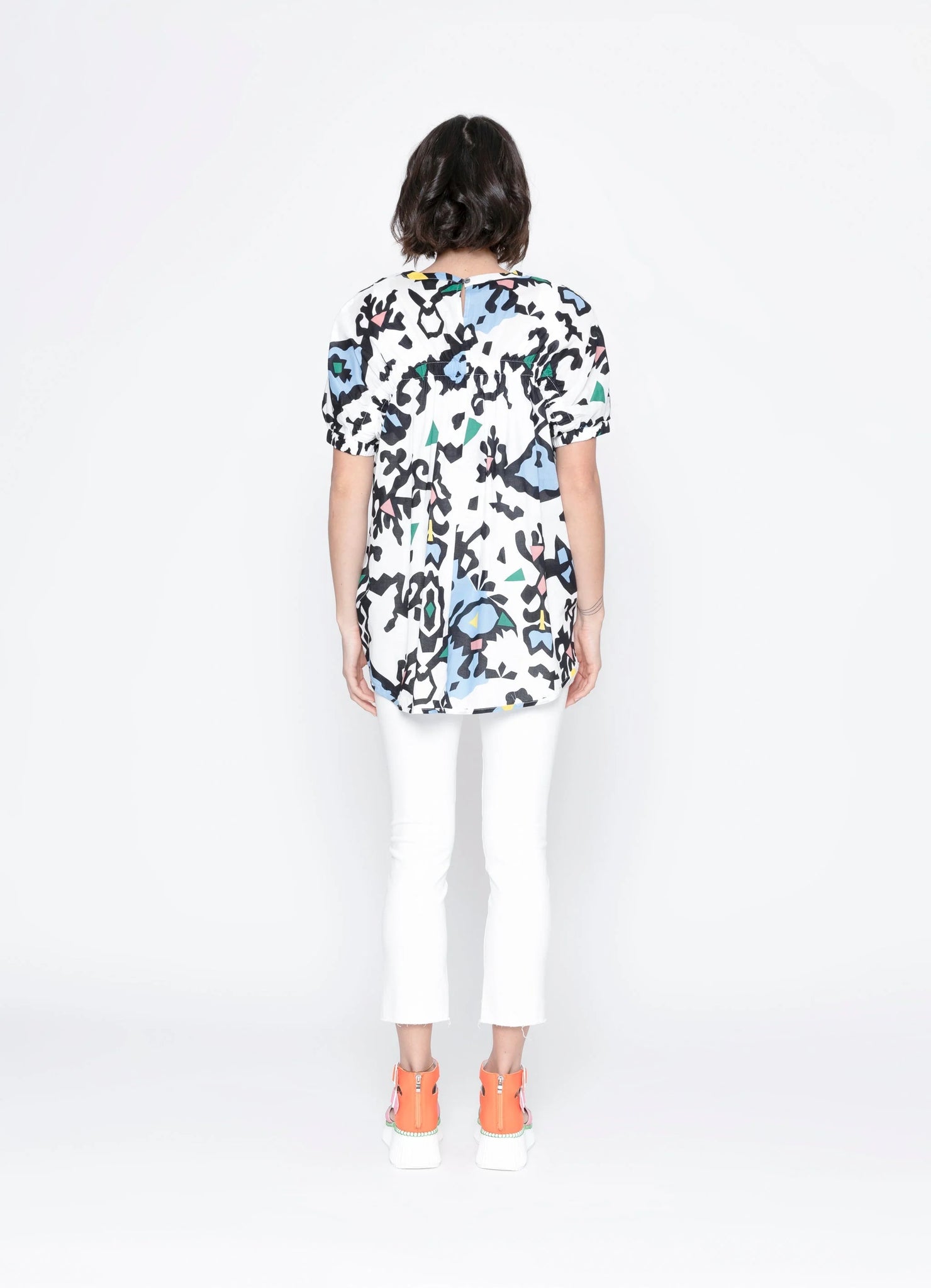 - Center back neck button closure