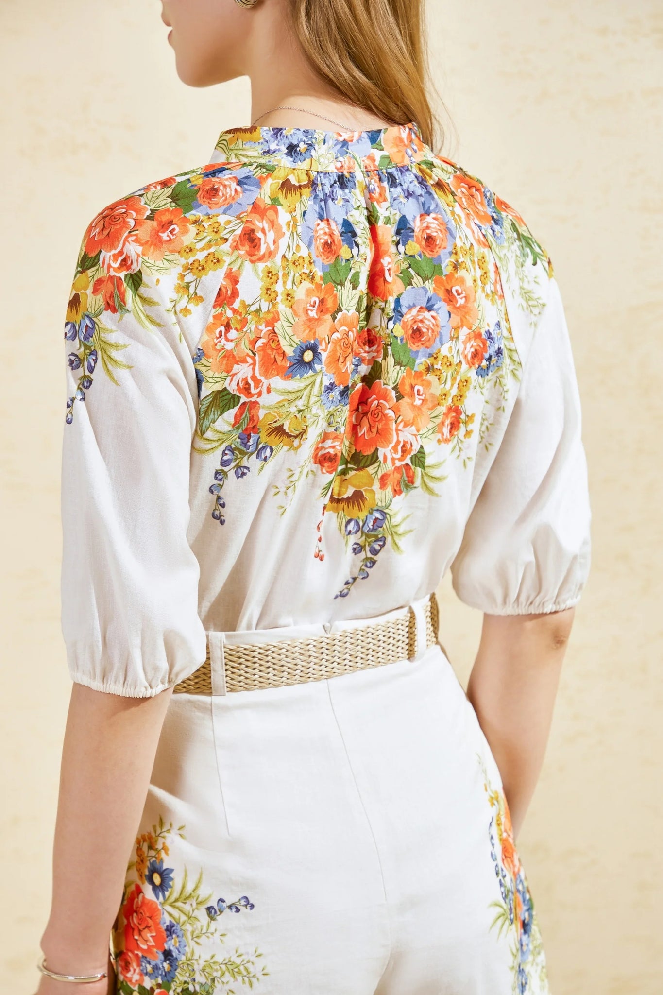 The fabric's slight texture enhances its natural, rustic charm while providing a smooth, easy drape.The blouse features a striking positioning print, where the design is carefully placed for maximum visual impact. The print creates a sense of movement and flow, with patterns arranged to highlight the natural lines of the blouse. The thoughtfully positioned artwork adds an artistic, modern touch to the otherwise simple design, making the blouse stand out with its unique and refined aesthetic.