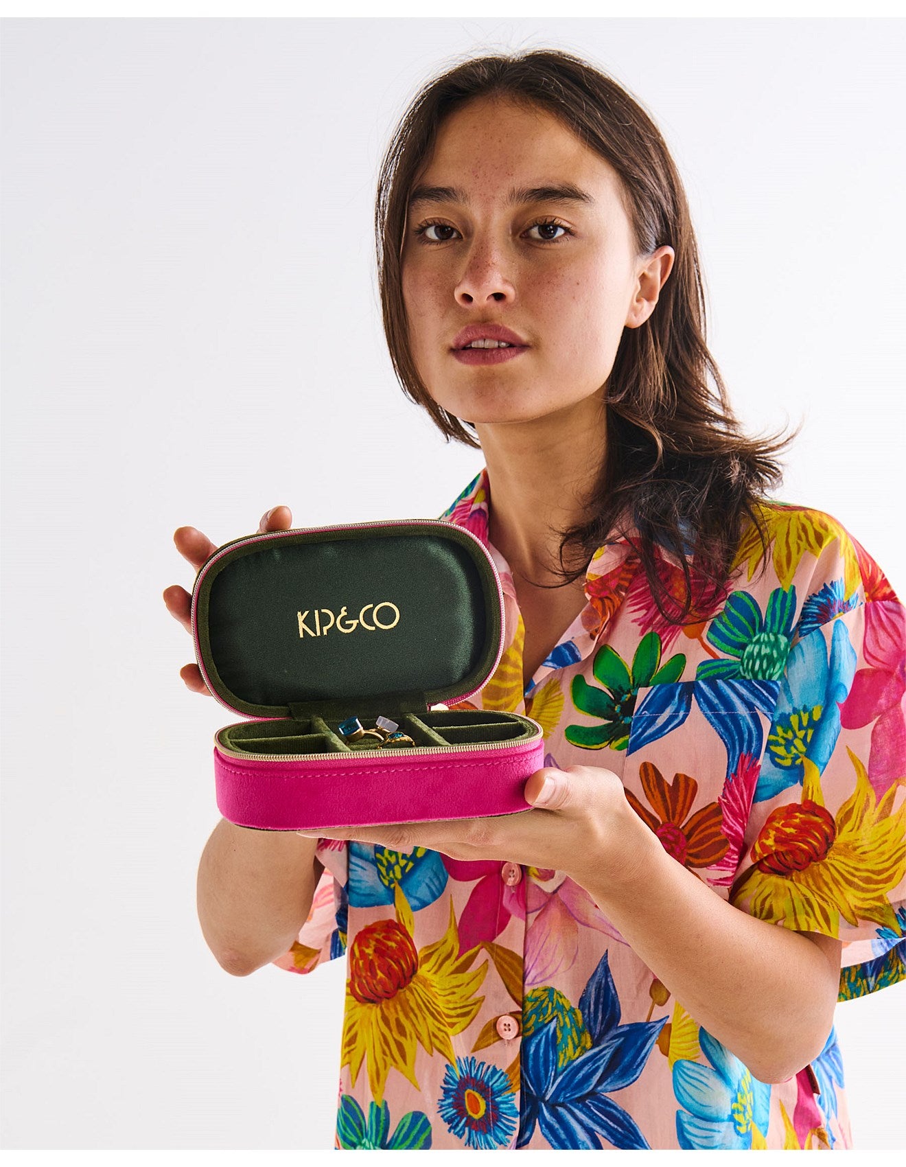 Chic, compact, and travel-ready! The Prickly Pear Travel Velvet Jewellery Box keeps your rings, earrings, and tiny treasures safe on the move With a zipper closure, four little side compartments, and a central ring cushion, it’s perfect for popping into your bag for weekend getaways or daily adventures Covered in bright pink velvet with a contrasting khaki green lid and interior, this little beauty makes organisation a stylish affair wherever you go. Printed velvet outer and plain velvet inner. 15 cm W x 9 cm L x 5 cm H. Made in India. Proudly carbon neutral. Independent and female founded. Made in India. Proudly carbon neutral. Independent and female founded.