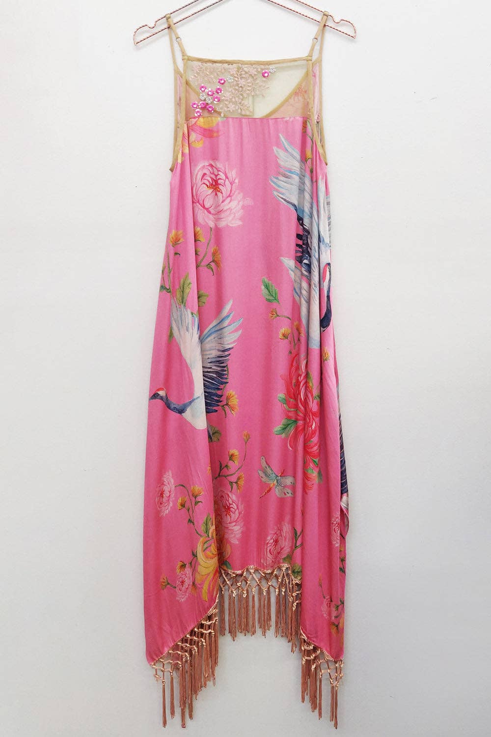 Washed crane floral print adjustable strap dress, sequin embroidered mesh back yoke, knotted fringe hem * Dusty rose * Hand wash warm with like colours * Line dry * 100% viscose * Design in Los Angeles, California