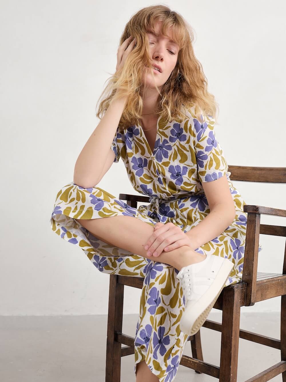 Stay cool on sunny days in this stylish jumpsuit, with its easy-to-wear fit-and-flare shape, soft V neck button front and short sleeves. It's finished with side pockets, belt loops and a removable waist tie. Easy to dress up or down, it'll be your go-to piece for summer.